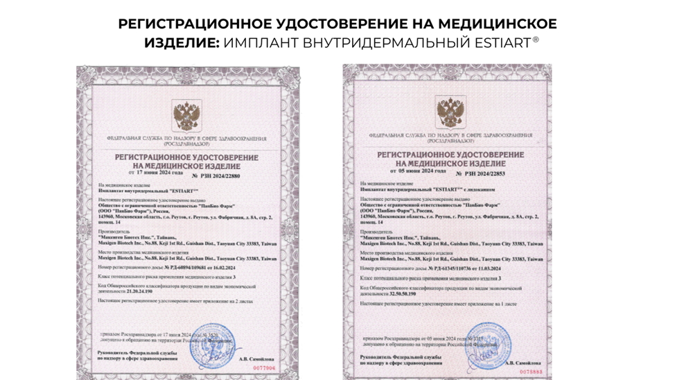 Наличие регистрационного удостоверения подтверждает, что ESTIART® является легальным и разрешённым к применению медицинским изделием.